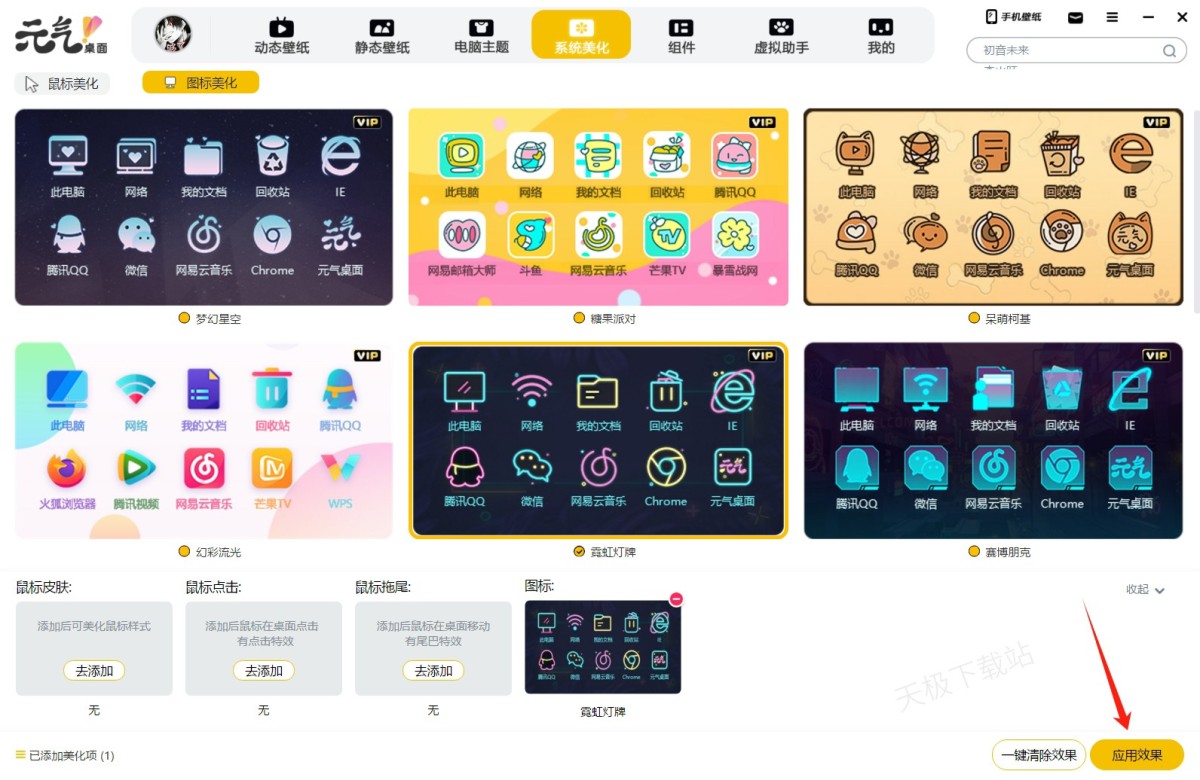 4.在图标美化页面,你可以看到各种精美的桌面图标样式,你可以根据自己的喜好进行选择。找到心仪的图标样式后,点击“应用效果”即可将其应用到你的电脑桌面上。
