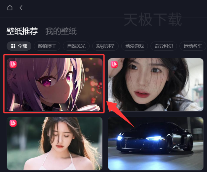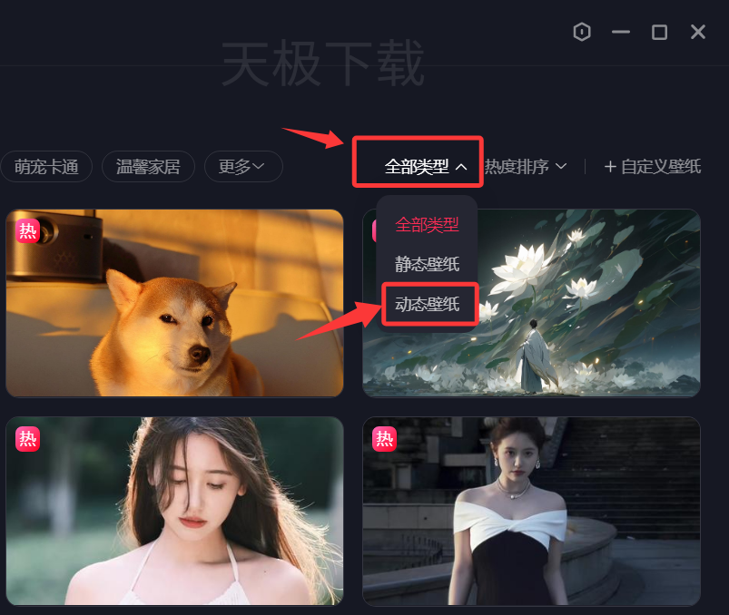 2.点击右侧的【全部类型】,选择【动态壁纸】;