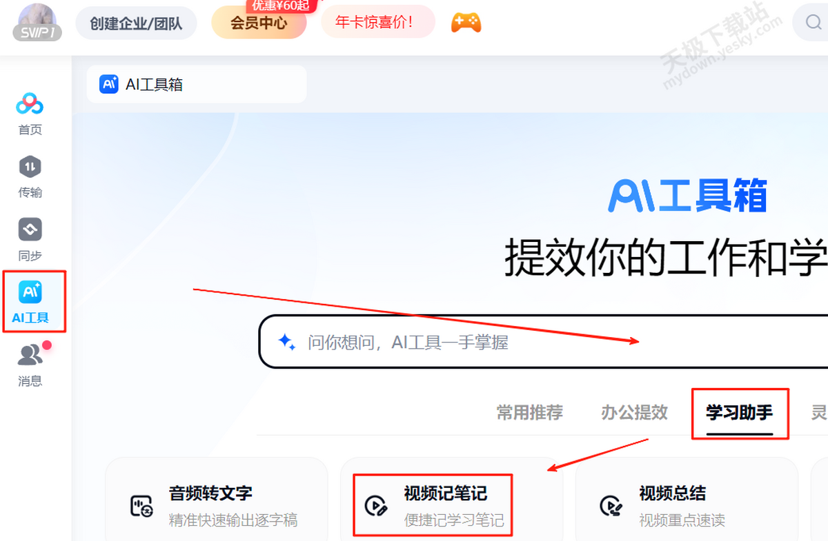 1.下载并打开最新版本的百度网盘,点击左侧【AI工具】,选择中间【学习助手】,点击下方【视频记笔记】。