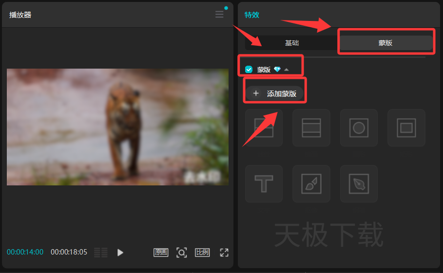 4.选中【模糊】特效,选择【蒙版】,勾选【蒙版】,点击【添加蒙版】;
