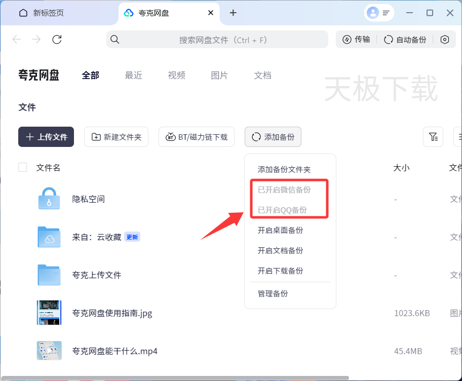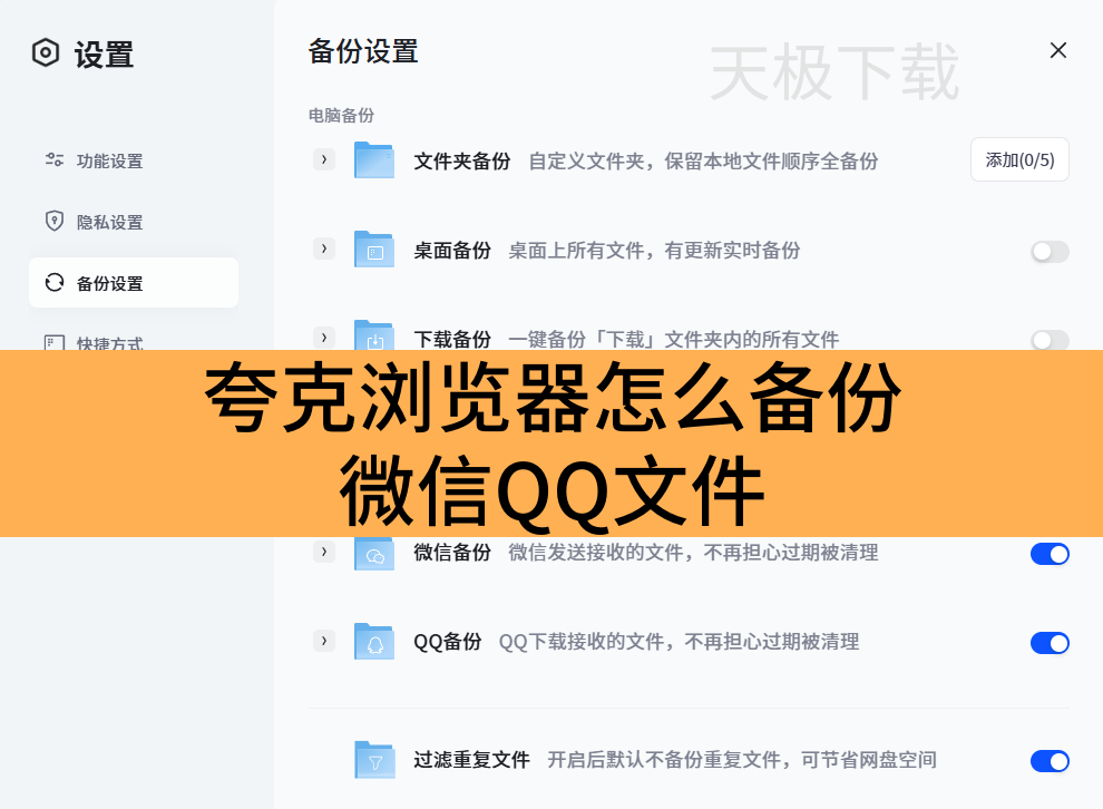 夸克浏览器除了可以备份QQ和微信数据之外,还可以设置桌面备份、下载备份、文档备份,以及自定义文件夹备份,用户可以在设置中自行开启。