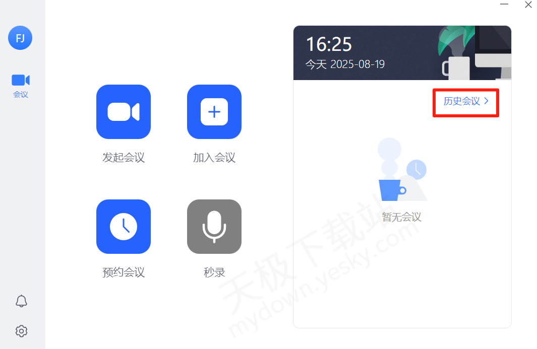 1.下载并打开最新版本的网易会议,登录账号,点击首页右侧【历史会议】。