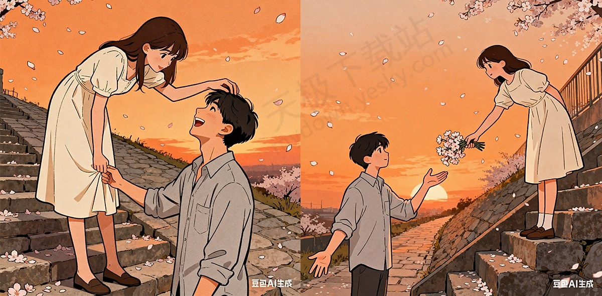 2.生成一组情侣头像,风格是简约+线条画,主题内容是一对情侣漫步在樱花小道,女生在台阶上走,男生在台阶下走,背景是黄昏时分,1:1比例。