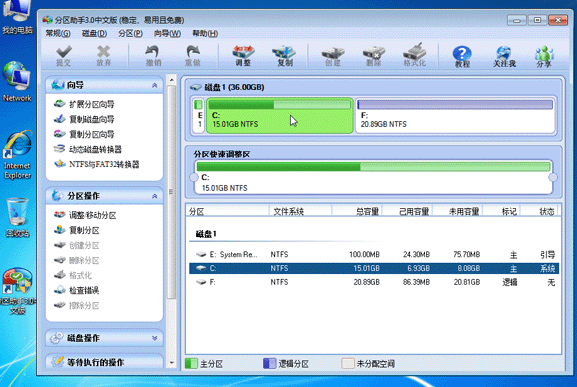 ??1、在电脑上打开分区助手,您将看到下面的主界面,同时也可以看到C分区是15.01GB,F分区是20.89GB,如图1所示。
