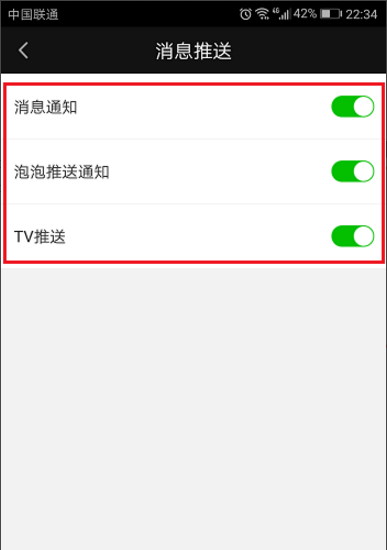 ?3、进入消息推送界面,可以看到默认tv推送、消息推送、泡泡推送通知都是开启的,如下图所示:?