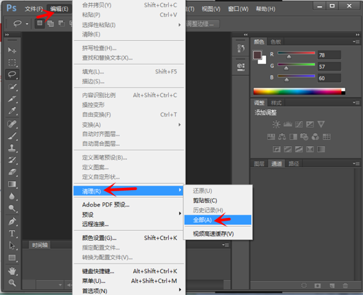 ?PS工作时间过长,运行速度会变缓慢,这是因为你没有及时释放占用的内存,重启PS软件就行了。如果你不想重启,可以快速清理PS占用的内存空间,点击菜单栏的【编辑】——【清理】——【全部】,清理所有历史记录和剪切板的任何信息。?