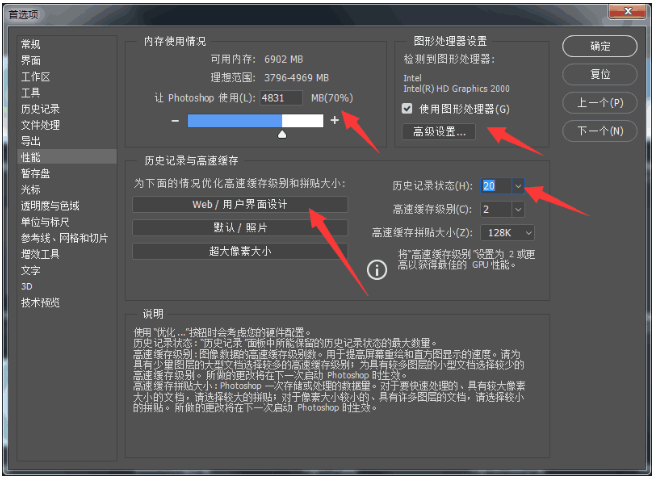 ?高速缓存:如果你是设计师,可以选择【Web/用户界面设计】、【超大像素大小】,设定完毕,右侧的【高速缓存级别】和【高速缓存拼贴大小】会进行自动设定。?