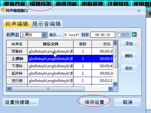 5.排除功能,可以实现一周内哪天排除(不播放)哪一道任务;自动切换方案功能,可以实现在不同时间段(如不同季节)自动执行不同的打铃方案。