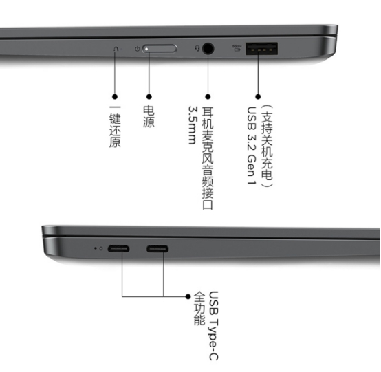 ??小新Pro13?2020锐龙版采用了金属机身设计,延续了之前简约的设计风格,符合年轻用户的审美。其机身重量为1.28kg,厚度仅为15.95mm,非常轻薄,方便外出携带。接口方面,拥有两个全功能USB?Type-C以及一个USB3.2?Gen1和3.5mm耳机孔,不算非常丰富,不过日常基本够用。