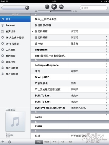 ?与iPod?Touch类似,iPad将音乐和视频播放分离成两个不同的应用程序。iPad的”音乐“程序看起来更像Mac版本的iTunes而非iPhone上的。顶部拥有控制器,包含播放,下一曲,上一曲的按钮,一个滑动控制杆用来播放时搜寻,另外还有一个音量控制滑块。在左边,是资源列表,让你选择音乐,podcast,有声读物或者播放列表。而在右边,你可以查看和选择音轨进行播放。