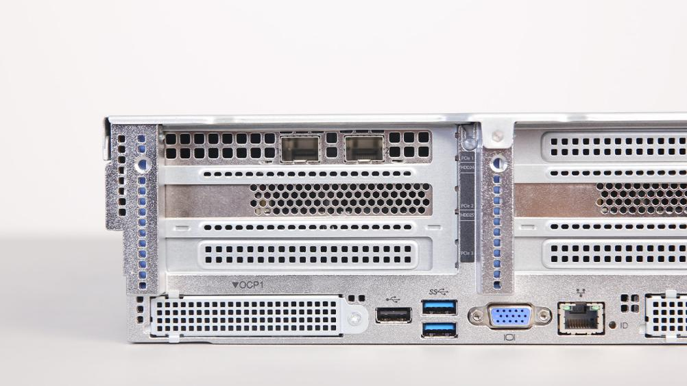 本次送测样机配备了Mellanox ConnectX-6 Lx 10/25GbE SFP28 2-Port PCIe网卡,在后面板下方还有两个2个OCP 3.0插槽,提供高速且可靠的网络支持。