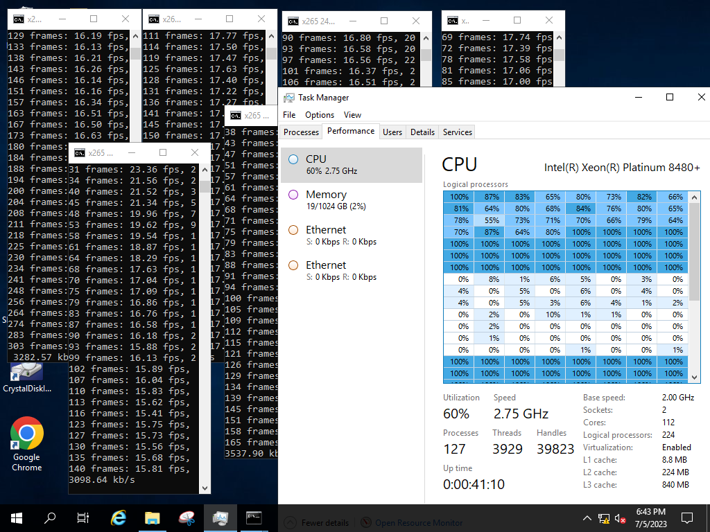 X264以及X265 FHD Benchmark均是视频转换类测试工具,可以测试CPU的编解码能力,但占用线程数最高为16,为了尽可能测试极限性能,选择将应用程序多开,并行执行视频编码测试(测试结果仅供参考)。