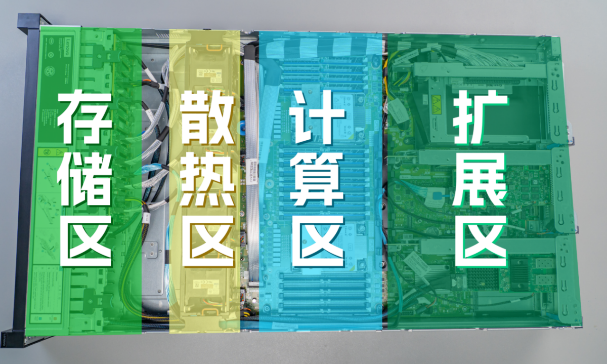 联想问天WR5220 G3服务器机箱内部的设计由前至后依次为存储区、散热区、计算区和扩展区。