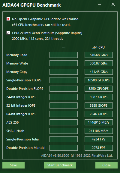 不过不同于消费级处理器的高性能混合架构,第四代至强处理器的核心均为“性能核”也就是Golden Cove,所以相比上代显著增加的核心数带来了更出色的多线程性能,助力算力升级。搭载双路至强的联想问天WR5220 G3在AIDA64的CPU性能测试中,单精度浮点成绩为10.5TFLOPS,双精度浮点成绩为5.25TFLOPS。