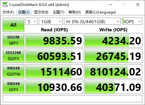 其中SATA SSD单盘(2.5寸英特尔S4520 1.92TB SATA SSD)的顺序读写速度分别在530MB/s、510MB/s左右;组建RAID 0后,顺序读写可以提升支持14960MB/s、13690MB/s,4K(Q32T16)随机读取、写入速度分别约为135KIOPS、113KIOPS。