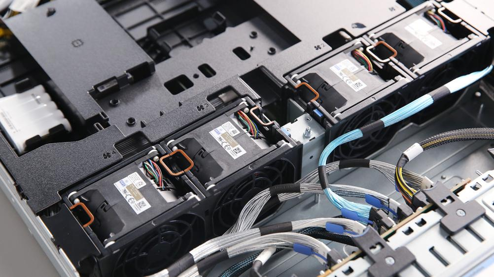 本次送测样机配备了前置16块2.5寸硬盘,在硬盘区可以看到布满六边形网孔金属格栅,提升服务器内部通风效率,确保散热效果。