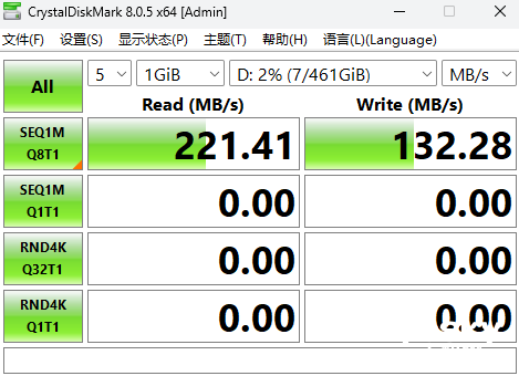 ??接下来,我们利用CrystalDiskMark软件进行了进一步的测试。这款软件允许用户选择不同的测试块大小,从512KB到8MB不等,以评估存储设备的读写性能。在CrystalDiskMark?8.0.4版本下,金士顿DataTraveler?SE9G3的读取速度为221MB/s,写入速度为132MB/s,读取和写入速度均超过官方标称速率。