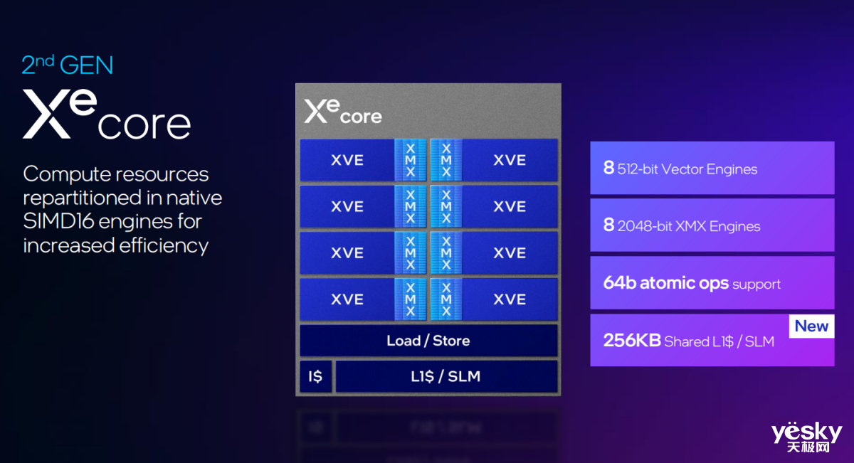 第二代Xe核心拥有8个512 bit的矢量引擎、8个2048 bit的XMX引擎,升级的全新矢量引擎在支持SIMD16的基础上增加了对SIMD 32的支持,还支持TF32。