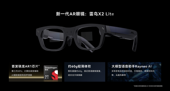 ??雷鸟X2?Lite搭载了高通骁龙AR1芯片,该芯片是高通首款面向轻薄型智能眼镜打造的专用处理器,大幅优化了功耗,并集成了高通第三代?NPU,在图像增强、语音交互、图片搜索等方面均有明显优势。