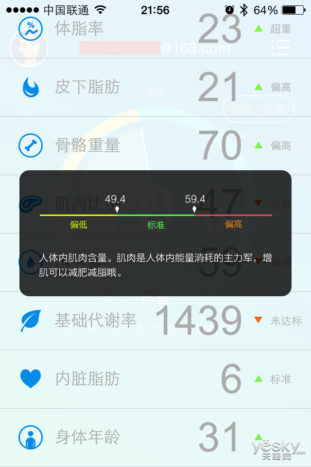 ??在笔者体验的过程中,RyFit云悦体质分析仪已经在很多细节上做了简化处理。比如,蓝牙连接功能,很多可穿戴设备都需要用户自己进行操作连接,而该机则采用了自动识别用户身份和连接蓝牙的方式,为用户的使用提供很大的便利。为了方便用户了解测量数据的作用,APP上还针对不同数据进行介绍及是否达到标准做出了标注,用户可以更直接的了解。当然,仪器还可以脱离APP来应用,通过屏幕即可查看到检测的结果,非常方便。